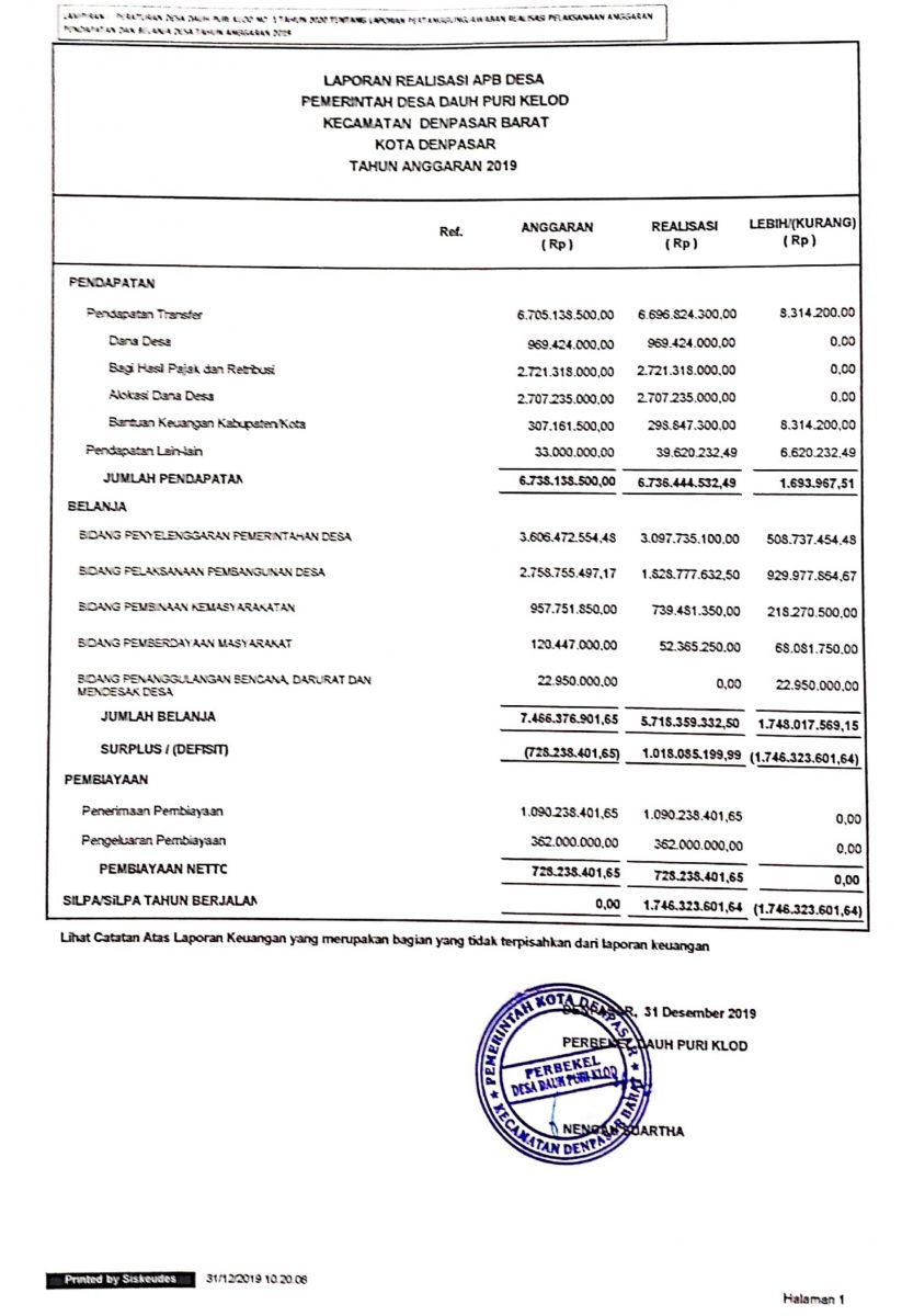 LAPORAN REALISASI APB DESA PEMERINTAHAN DESA DAUH PURI KLOD TAHUN ANGGARAN 2020